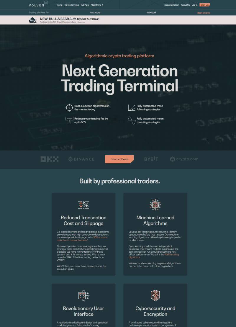 Vi är stolta över att kunna meddela vårt partnerskap med Volven AS, ett banbrytande fintech-företag som specialiserar sig på skräddarsydda algoritmiska handelslösningar för institutionella kunder inom den digitala valuta marknaden. Volven AS erbjuder en nästa generations handelsplattform som använder självlärande algoritmer för att hjälpa handlare identifiera komplexa marknadsmöjligheter med enastående precision. Vi ser fram emot att arbeta med Volven AS.