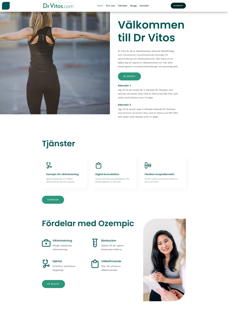 Vi är glada att presentera vårt partnerskap med DrVitos, en digital vårdplattform specialiserad på fetmahantering. DrVitos erbjuder en innovativ lösning som kopplar patienter direkt till legitimerade läkare för medicinsk rådgivning och utskrivning av läkemedel som Ozempic. Med en enkel och användarvänlig plattform kan patienter få snabb tillgång till vård oavsett var de befinner sig. DrVitos fokuserar på långsiktig hälsokontroll genom en prenumerationsmodell som säkerställer kontinuerlig behandling och övervakning. Genom detta partnerskap kan vi tillsammans bidra till förbättrad patientvård och möta den växande efterfrågan på specialiserade tjänster för fetmahantering i Europa.