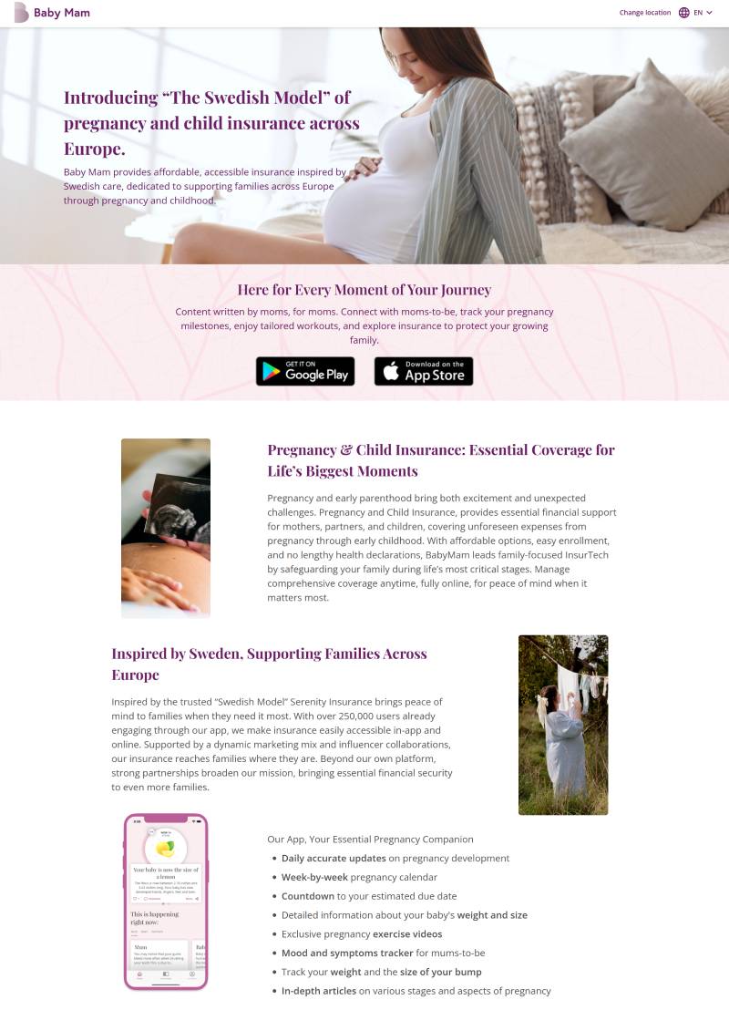Baby Mam introducerar ”den svenska modellen” för gravid- och barnförsäkringar till hela Europa. Med en vision om att erbjuda ekonomisk trygghet för familjer under de mest kritiska stadierna i livet, har vi utvecklat innovativa försäkringslösningar som täcker allt från graviditet till långsiktig barnhälsa.
